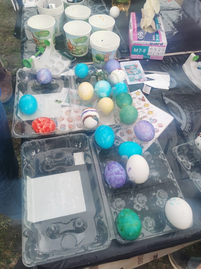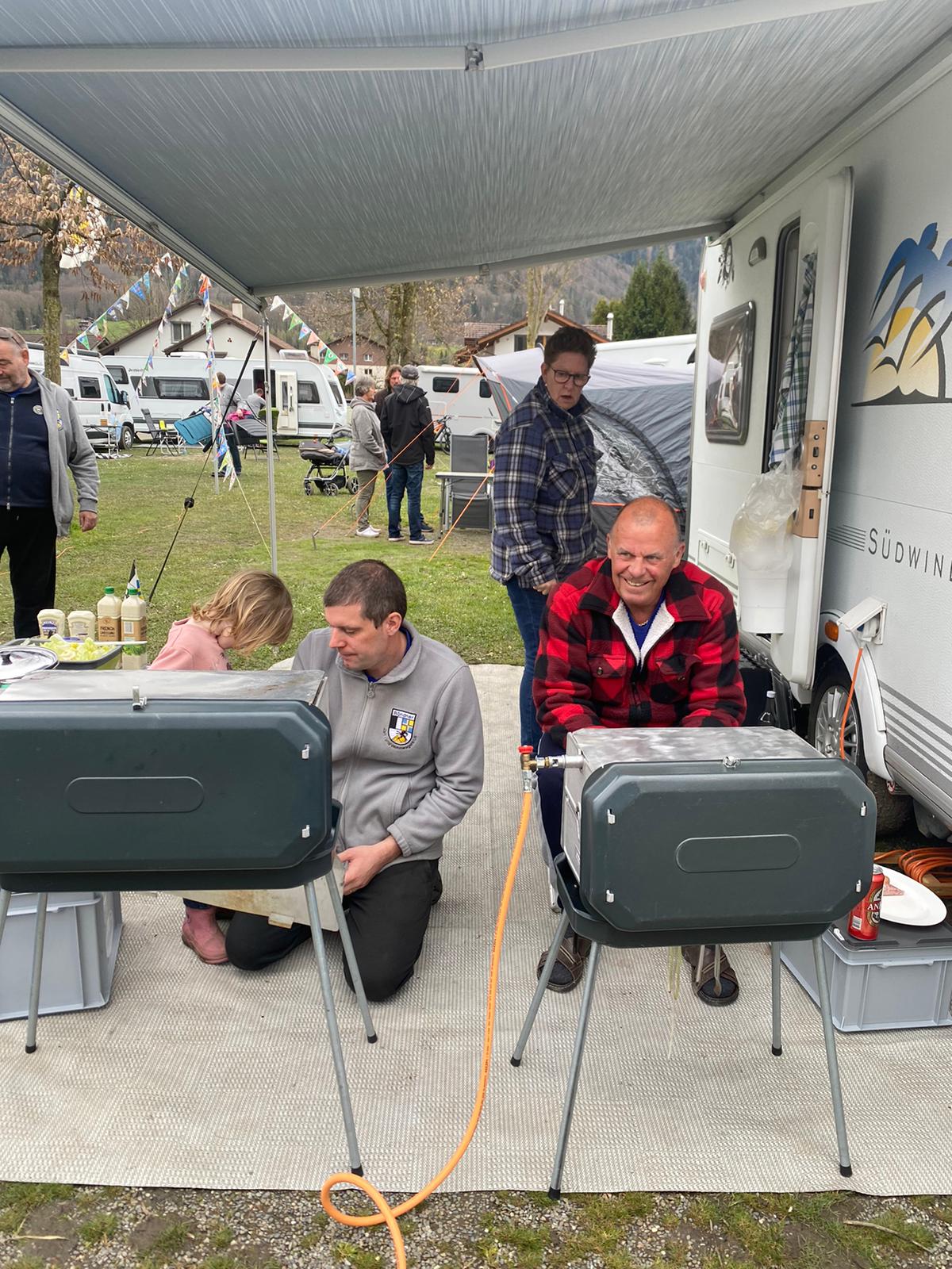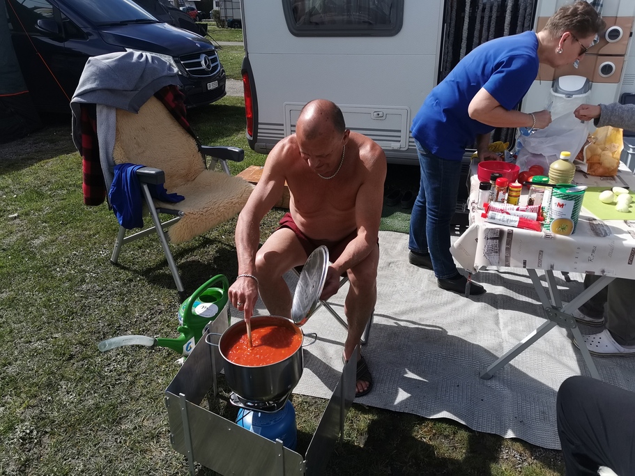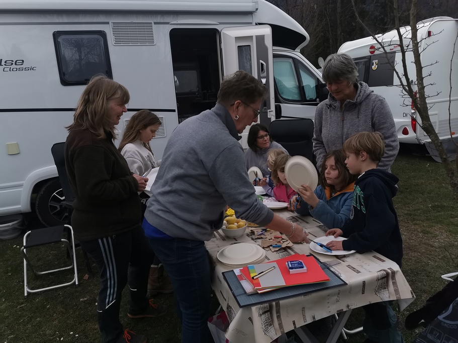 Als alle wieder auf dem Camping angekommen waren, stand Eier färben auf dem Programm. Die Kinder färbten fleissig und hatten richtig Spass dabei. Anschliessend genossen wir einen Apero und die Vorbereitungen auf das gemeinsame Abendessen lief auf Hochtouren. Leider meinte es Petrus nicht gut mit uns und so fing es an zu Regnen. So musste jeder das Abendessen bei unserer Küche abholen und bei sich unter Dach essen.