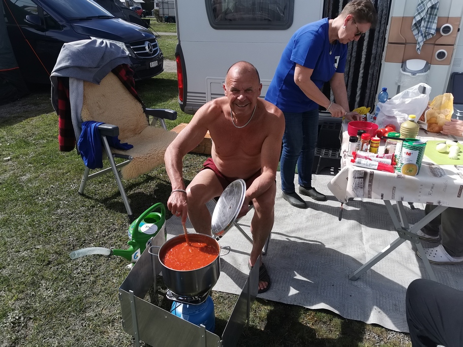 Anschliessend genossen wir einen leckeren Apero und das Abendessen zusammen. Natürlich durfte unsere traditionelle Tischreihe nicht fehlen. Nach dem Abwasch gingen einige Mitglieder noch in das Campingeigene Restaurant und genossen einen Schlummertrunk, bevor es in das Bett ging.