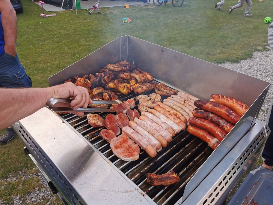 Kurz vor 18.00Uhr bildeten wir unsere obligate Tischreihe, welche erneut, sehr beeindruckend war. Punkt 18.30Uhr wurde das Abendessen eröffnet und so konnte sich jeder beim vorbereiteten Buffet selbst bedienen. Franz war unser Grillmeister und bediente alle mit Würsten, Filet und sonstigen Leckereien.